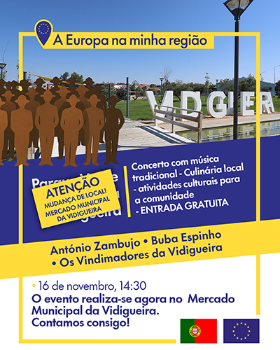 Este evento acontece domingo, 16 de novembro, a partir das 14h30, no Mercado Municipal de Vidigueira, localizado no Largo Frei António das Chagas, e contará com um concerto exclusivo que junta os artistas António Zambujo, Buba Espinho e o Grupo Coral da Vidigueira, uma sessão ao vivo de showcooking com a chef e influenciadora Joana Barrios, e atividades como a criação de um mural artístico coletivo no parque. A entrada é gratuita, estando limitada à capacidade máxima admitida no local.